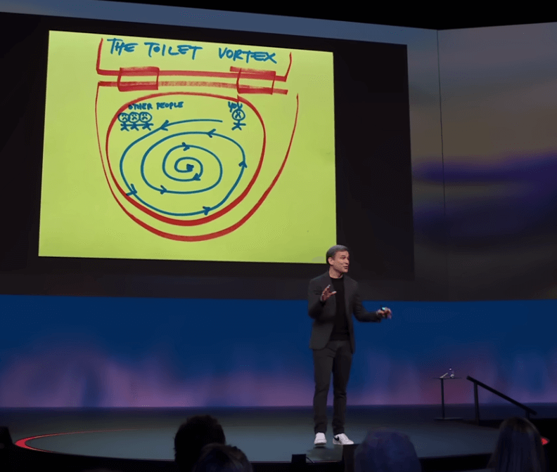 Harris introduces two distinct paths individuals can choose: the Toilet Vortex, characterized by self-flagellation and negativity, and the Cheesy Upward Spiral, where self-love leads to improved relationships and, consequently, better overall well-being.